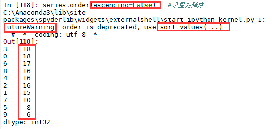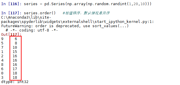 上面两个结果其实都是按值排序,并且结果中都给出了警告信息,即建议使用sort_values()函数进行按值排序。