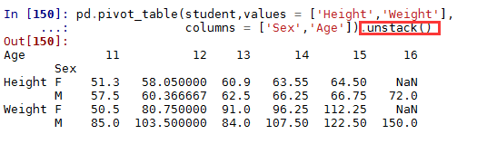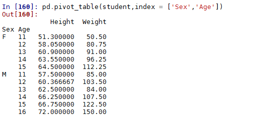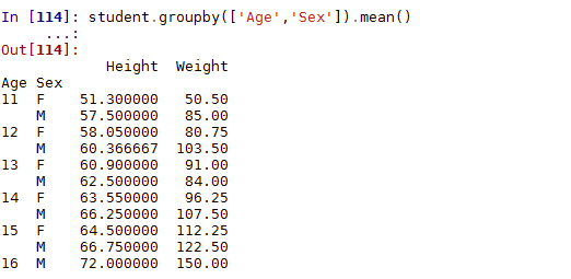 groupby还可以使用多个分组变量,例如根本年龄和性别分组,计算身高与体重的平均值:
