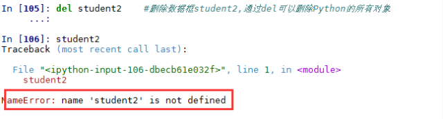删除数据框student2,通过del命令实现,该命令可以删除Python的所有对象。