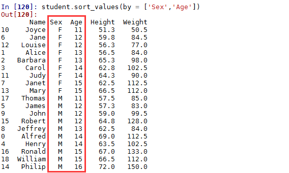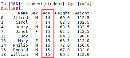 1 | In [66]: student[(student['Sex']=='F') & (student['Age']>12)][['Name','Height','Weight']] |