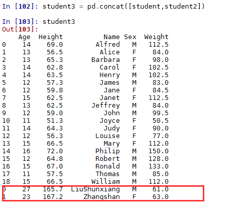 现在将student2中的数据新增到student中,可以通过concat函数实现: