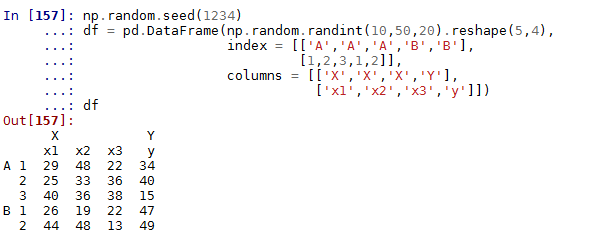 以上针对的是序列的多层次索引,数据框也同样有多层次的索引,而且每条轴上都可以有这样的索引,就类似于Excel中常见的这种形式: