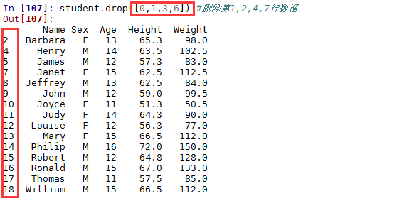 根据布尔索引删除行数据,其实这个删除就是保留删除条件的反面数据,例如删除所有14岁以下的学生:
