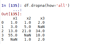 返回结果表明,数据中只要含有缺失值NaN,该数据行就会被删除,如果使用参数 how='all',则表明只删除所有行为缺失值的观测。